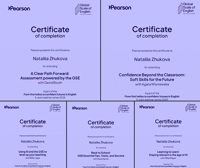 Протягом вересня 2025 року з метою підвищення професійної компетентності та впровадження новітніх методик викладання англійської мови у навчальний процес доцент кафедри “Іноземна філологія та переклад” Кущ Еліна Олексіївна відвідала 9 вебінарів від British Council та Pearson. Любимо свою роботу та стаємо краще.