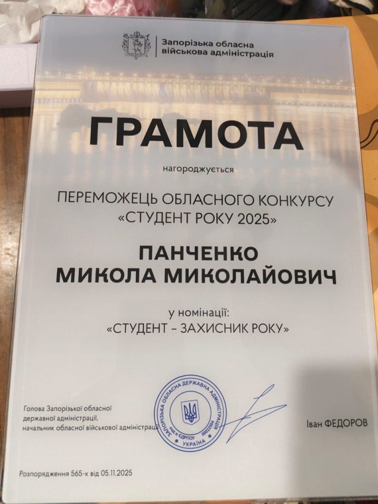 Вітаємо нашого студента Миколу Панченко гр. БАД-212 – переможця університетського та обласного етапів конкурсу «Студент року–2025» в номінації «Студент — захисник року». 14 листопада відбулась урочиста церемонія нагородження переможців обласного етапу конкурсу «Студент року–2025». Привітали переможців заступниця голови Запорізької обласної державної адміністрації Людмила Бухаріна, а від НУ «Запорізька політехніка» — проректор Андрій Іванченко. На жаль, Микола не зміг особисто бути присутнім на нагородженні, тому нагороду передали його дружині.