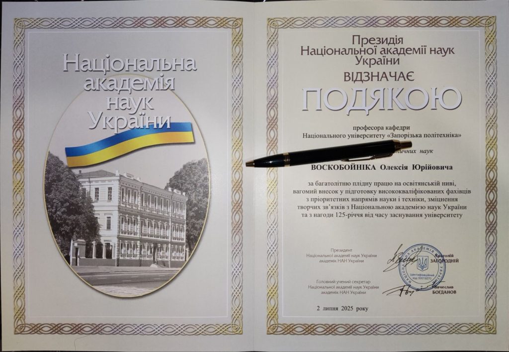 На урочистому зібранні, що було присвячено святкуванню 125-річчя Національного університету «Запорізька політехніка» професору кафедри «Композиційні матеріали, хімія та технології» Олексію ВОСКОБОЙНІКУ було вручено Подяку Президії Національної академії наук України.