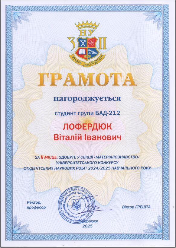 6 лютого 2025 року пройшла урочиста церемонія підбиття підсумків університетського конкурсу студентських наукових робіт. Лофердюк Віталій Іванович, студент гр. БАД-212 був нагороджений грамотою за ІІ місце у секції “Матеріалознавство”.
