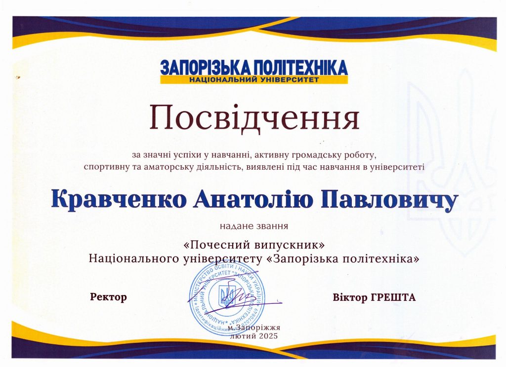 Випускник групи БАД-213м Кравченко Анатолій Павлович отримав звання “Почесний випускник” Національного університету “Запорізька політехніка”