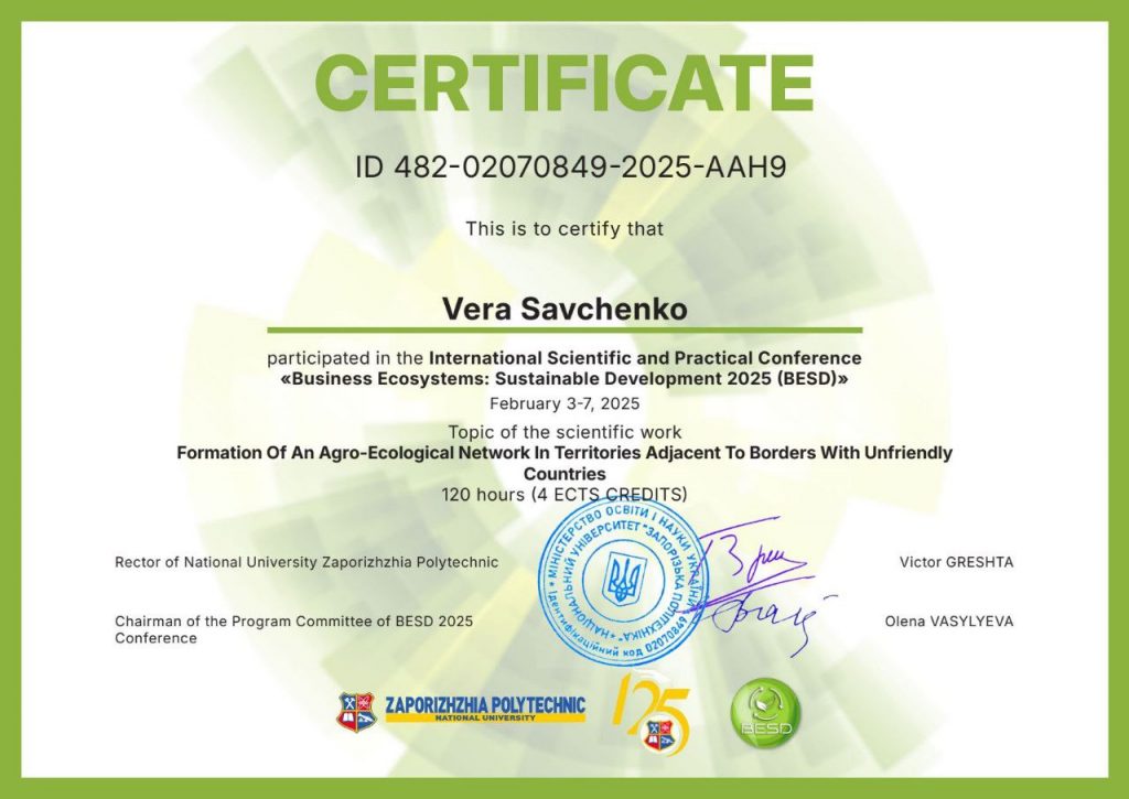 Доцентка кафедри Савченко Віра Олександрівна прийняла участь в Міжнародній науково-практичній конференції “Business Ecosystems: Sustainable Development 2025 (BESD)” 3-7 лютого 2025 року