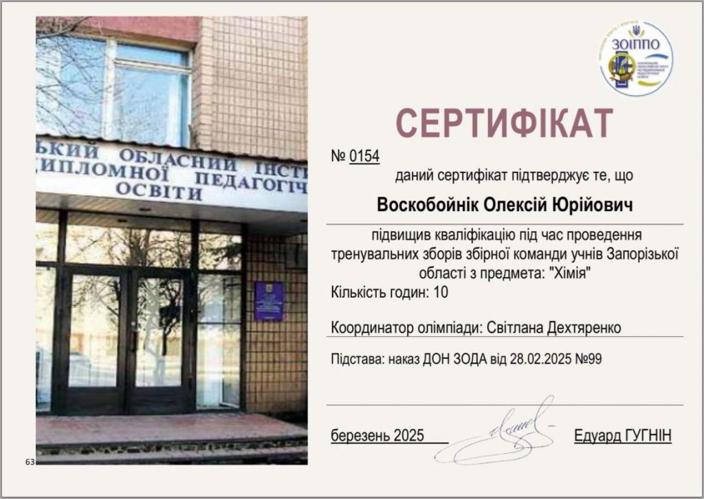 Професор Воскобойнік Олексій Юрійович та доцентка Петруша Юлія Юріївна підвищили кваліфікацію під час проведення тренувальних зборів збірної команди учнів Запорізької області з предмета “Хімія” та у складі журі з предмета “Хімія”