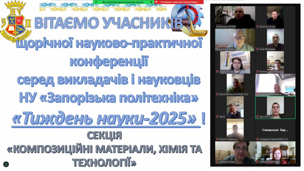 18 квітня 2025 року в рамках проведення науково-практичної конференції «Тиждень науки – 2025» відбулося засідання секції «Композиційні матеріали, хімія та технології». В засіданні прийняли участь викладачі та співробітники кафедри, студенти та аспіранти. Під час роботи було заслухано 24 доповіді та повідомлення за актуальними науково-практичними темами. Робота секції відзначилася високою зацікавленістю всіх її учасників та побажаннями проводити подібні зустрічі на такому ж високому рівні.