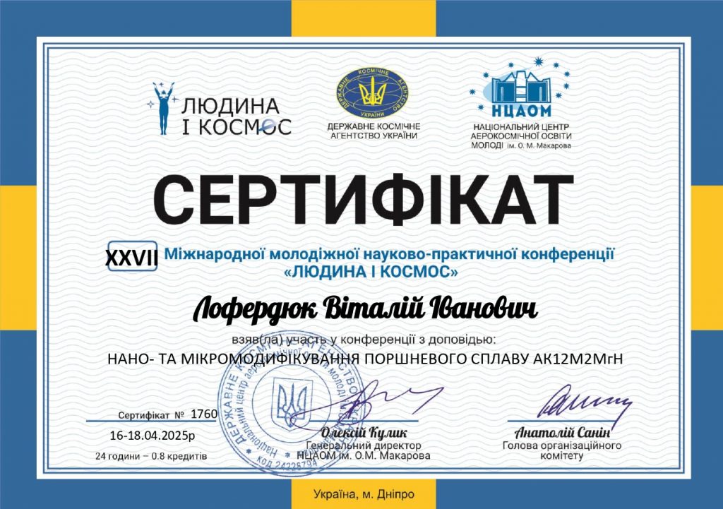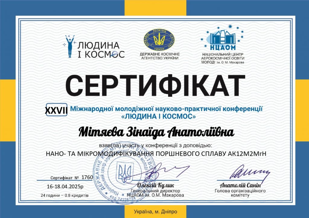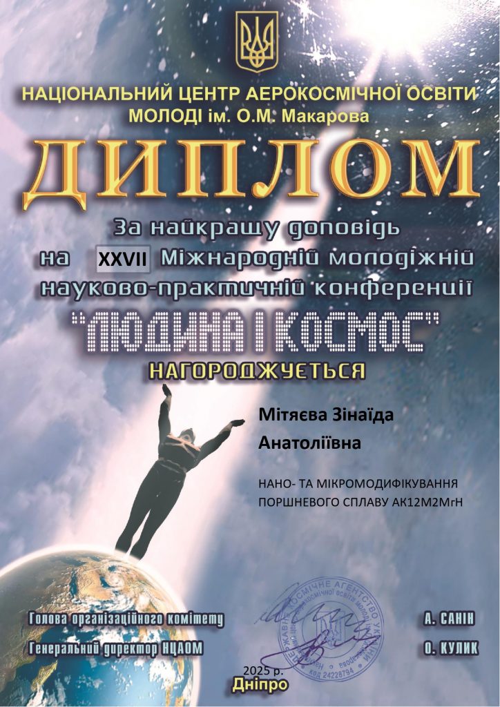Студенти групи БАД-212 Зінаїда МІТЯЄВА та Віталій ЛОФЕРДЮК взяли учать у XXVII Міжнародній молодіжній науково-практичній конференції «Людина і Космос» з доповіддю «Нано- та мікромодифікування поршневого сплаву АК12М2МгН». Зінаїда Мітяєва була відзначена дипломом за найкращу доповідь. Професор Олександр Мітяєв отримав сертифікат за якісну підготовку та керівництво науковою роботою студентів