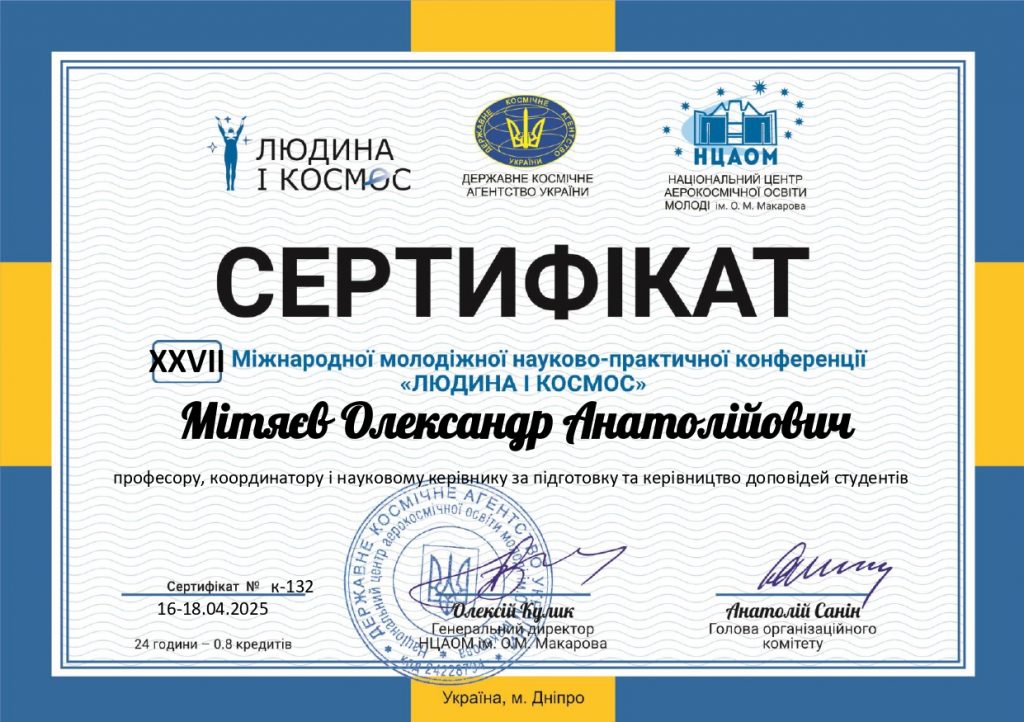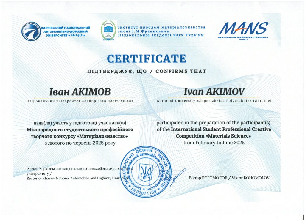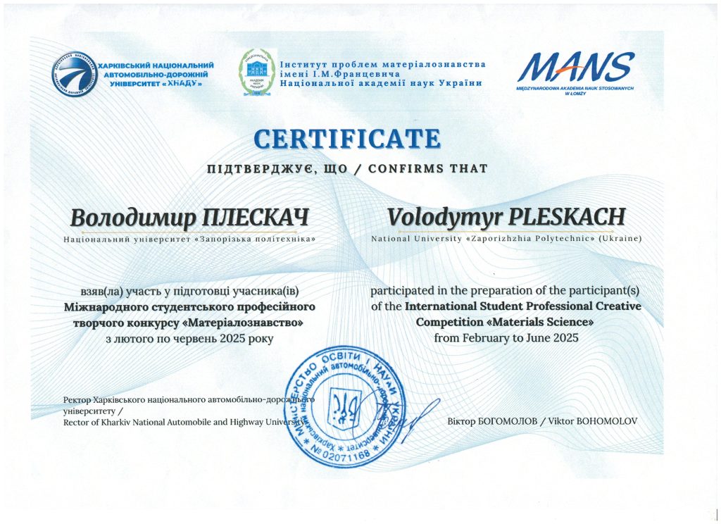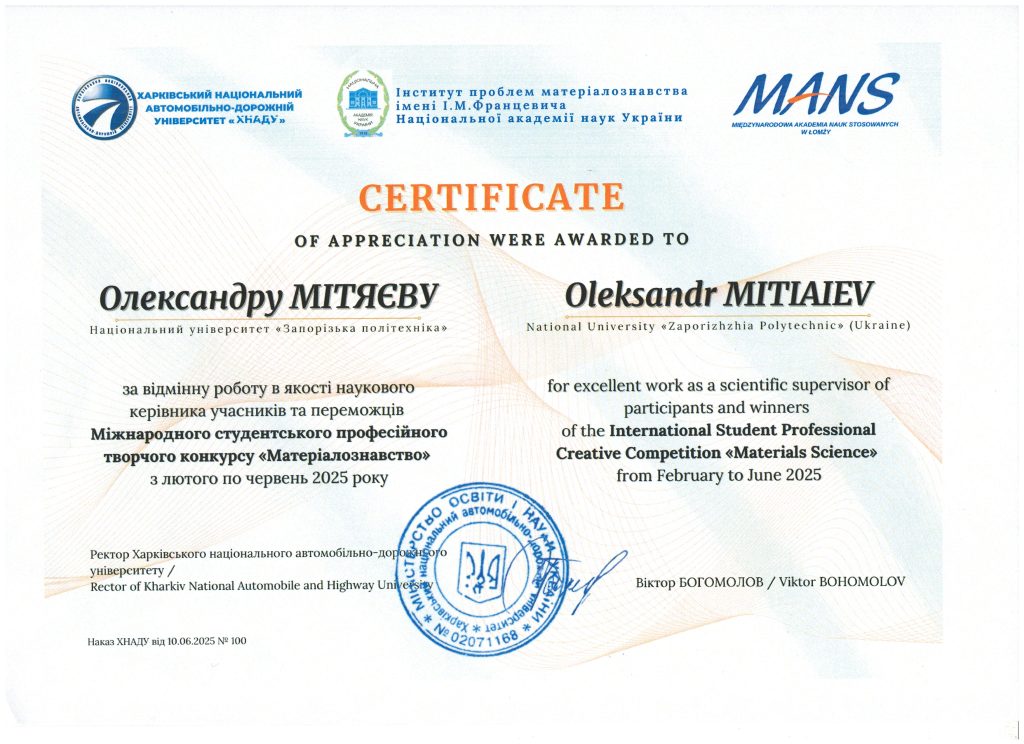 Завідувач кафедри професор Олександр МІТЯЄВ отримав сертифікат за відмінну роботу в якості наукового керівника учасників та переможців Міжнародного студентського професійного творчого конкурсу “Матеріалознавство”