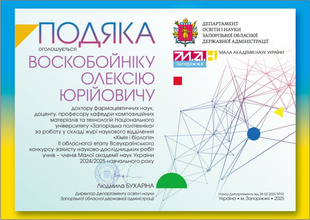 ВОСКОБОЙНІКУ ОЛЕКСІЮ ЮРІЙОВИЧУ доктору фармацевтичних наук доценту, професору кафедри композиційних матеріалів та технологій Національного університету «Запорізька політехніка» за роботу у складі журі наукового відділення «Хімія і біологія» ІІ обласного етапу Всеукраїнського конкурсу-захисту науково-дослідницьких робіт учнів – членів Малої академії наук України 2024/2025 навчального року оголошується Подяка.