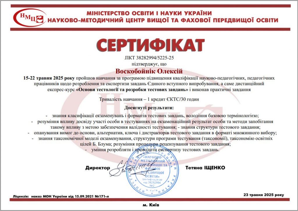 Професор Воскобойнік Олексій Юрійович підвищив кваліфікацію 15-22 травня 2025 року пройшов навчання за програмою підвищення кваліфікації науково-педагогічних, педагогічних працівників щодо розроблення та експертизи завдань Єдиного вступного випробування, а саме дистанційний експрес-курс «Основи тестології та розробки тестових завдань».