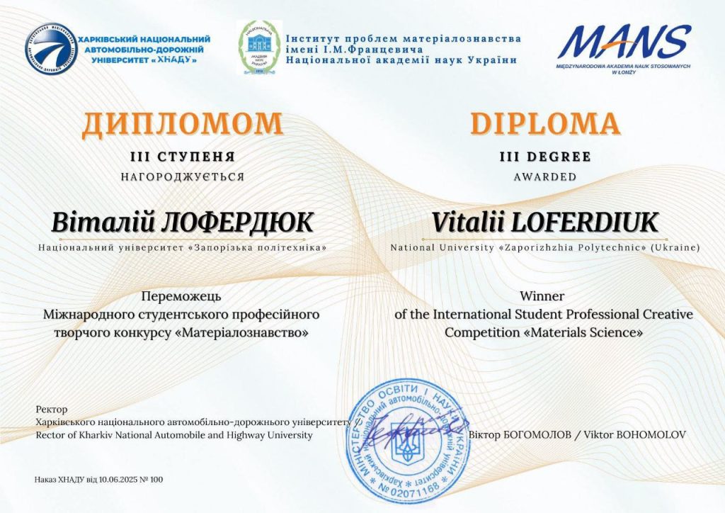 Студента групи БАД-212 Віталія ЛОФЕРДЮКА нагороджено дипломом ІІІ ступеню за перемогу у Міжнародному студентському професійному творчому конкурсі “Матеріалознавство”