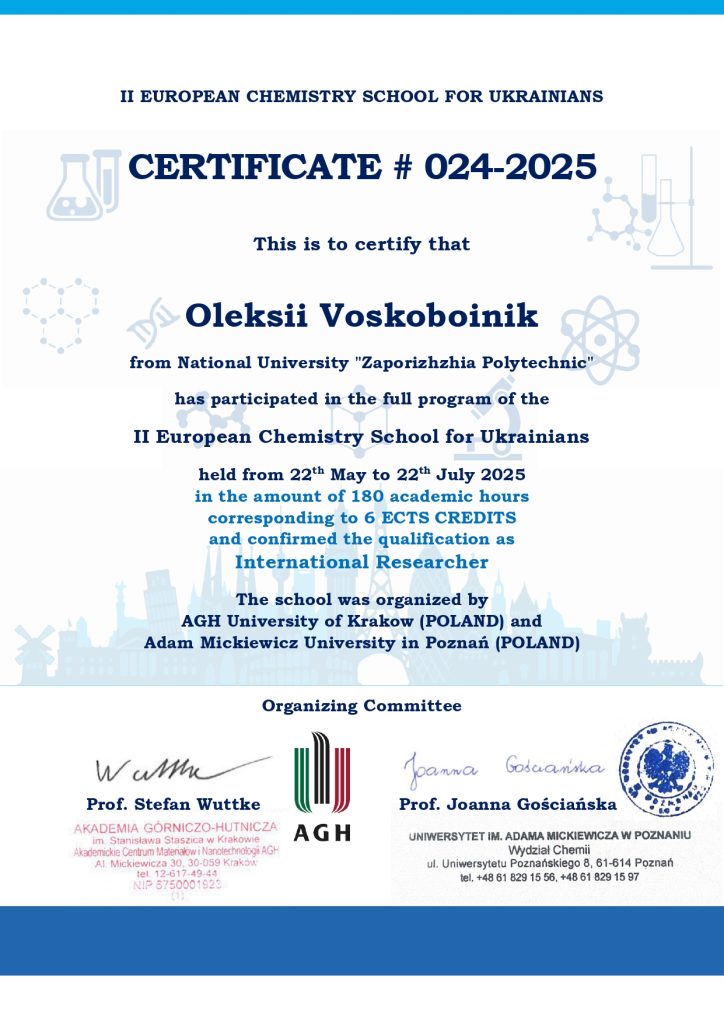 Професор кафедри Олексій ВОСКОБОЙНІК пройшов навчання за програмою ІІ Європейської хімічної школи для українців
