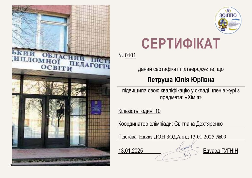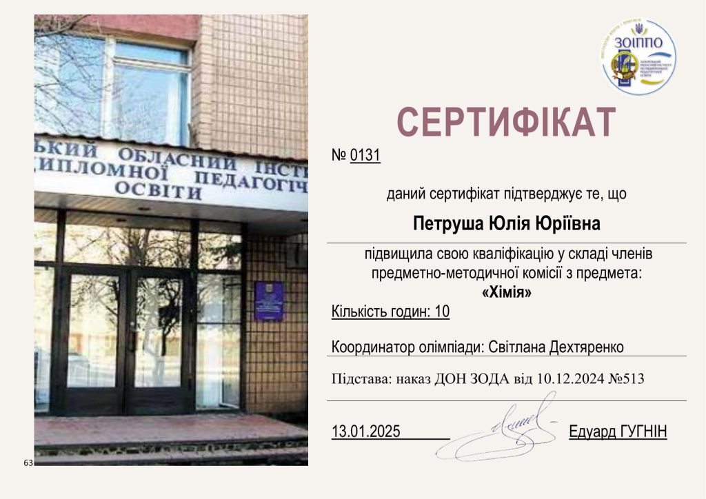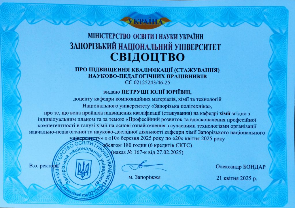 Доцентка кафедри Петруша Юлія Юріївна підвищила кваліфікацію науково-педагогічних працівників в Запорізькому національному університеті на кафедрі хімії