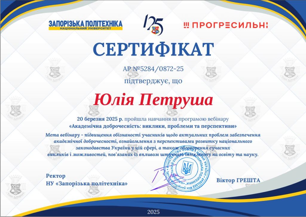 Доцентка кафедри Петруша Юлія Юріївна пройшла навчання за програмою вебінару “Академічна доброчесність: виклики, проблеми та перспективи”
