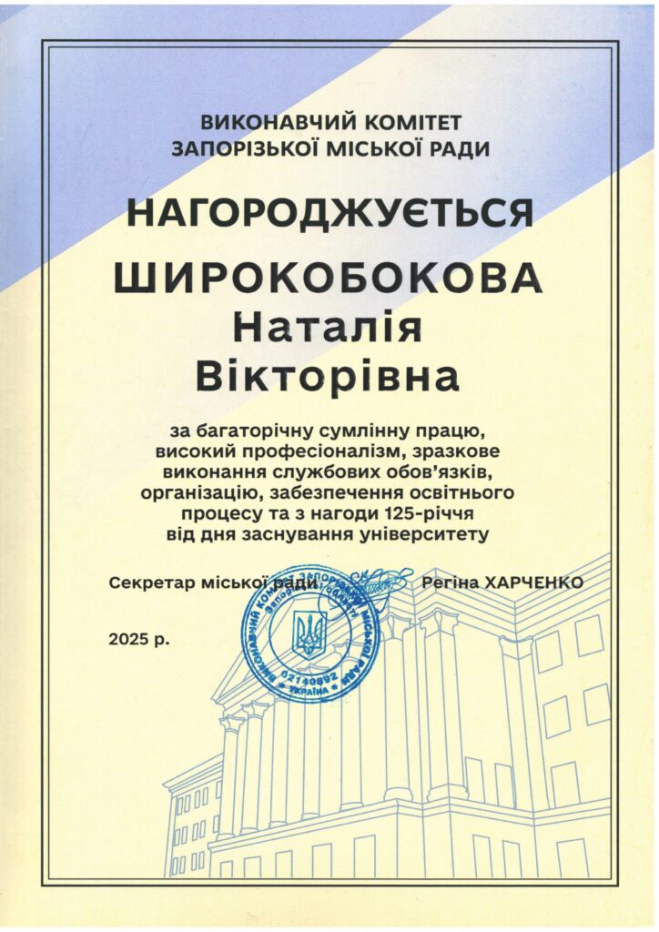 За багаторічну сумлінну працю, високий професіоналізм, організацію і забезпечення освітнього процесу доцент кафедри, канд.техн. наук Наталія Широкобокова нагороджена Почесною Грамотою виконавчого комітету Запорізької міської ради.