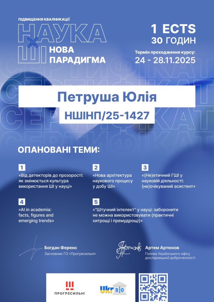 Доцентка кафедри Юлія ПЕТРУША успішно завершила курс «Наука ✕ ШІ: нова парадигма», який тривав протягом 24 листопада – 28 листопада 2025 р. Опанування цього онлайн-курсу дозволило навчитися ефективно та відповідально використовувати інструменти штучного інтелекту при дотриманні академічної доброчесності.