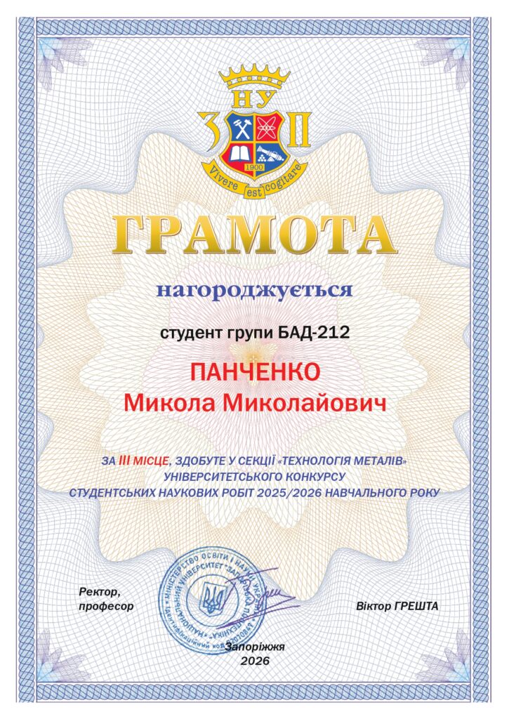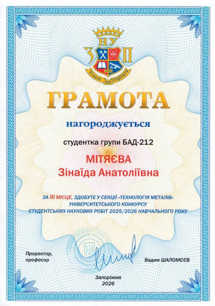 Студенти групи БАД-212 Зинаїда МІТЯЄВА та Микола ПАНЧЕНКО прийняли участь в університетському конкурсі студентських наукових робіт і були нагороджені грамотами за ІІІ місце у секції “Технологія металів”.