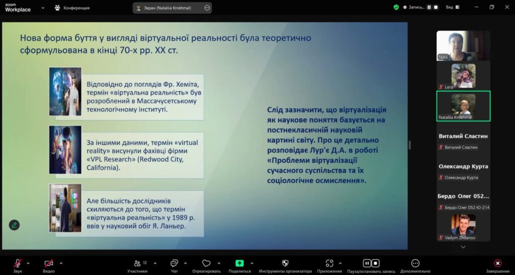 18 квітня 2025 року КРОХМАЛЬ Наталією, доцентом кафедри «Філософія, політологія та соціологія» Державного торговельно-економічного університету, кандидатом філософських наук, доцентом, провідним фахівцем в галузі досліджень діджиталізації суспільних відносин, на запрошення РЄЗАНОВОЇ Наталії, доцента кафедри «Політологія та загальноправові дисципліни», кандидата філософських наук, доцента була проведена гостьова лекція для здобувачів вищої освіти спеціальності 052 «Політологія» НУ «Запорізька політехніка» на тему: «Віртуалізація суспільно-політичного простору». Під час лекції було розглянуто питання віртуалізації соціальних інститутів, держави, економіки, власності, культури, освіти та науки. Проаналізовано процеси віртуалізації органів державної влади, тенденцій, що пов’язані із віртуалізацією політичної системи, особливості виборчого процесу з використанням цифрових технологій, розглянуто віртуальні держави як продукт розвитку віртуального простору, що не мають аналогів на політичній карті сучасного світу. Присутні активно долучилися до дискусії, ставили запитання та обговорювали виклики та можливості політики у віртуальному середовищі. Дякуємо пані Наталії за цікаву доповідь і глибокий академічний діалог. Спільними зусиллями формуємо нове бачення політичних процесів у цифрову добу.