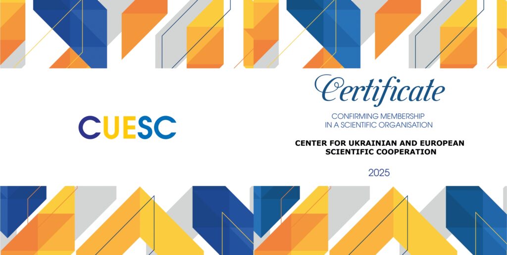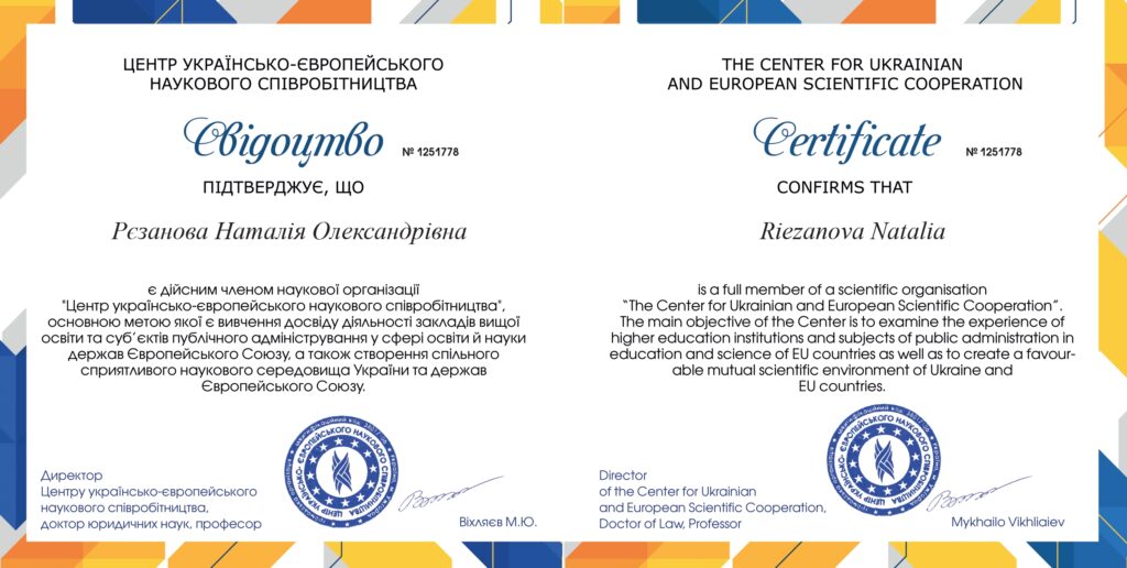 Доцент кафедри “Політологія та загальноправові дисципліни”, кандидат філософських наук, доцент РЄЗАНОВА Наталія отримала свідоцтво, що підтверджує її членство в науковій організації “Центр українсько-європейського наукового співробітництва”, основною метою якої є вивчення досвіду діяльності закладів вищої освіти та суб’єктів публічного адміністрування у сфері освіти й науки держав Європейського Союзу, а також створення спільного сприятливого наукового середовища України та держав Європейського Союзу.