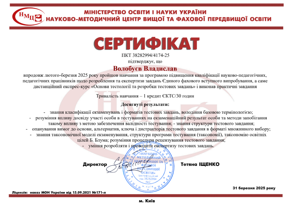 Доцент кафедри “Політологія та загальноправові дисципліни” Національного університету “Запорізька політехніка”, кандидат філософських наук, доцент ВОЛОБУЄВ Владислав впродовж лютого-березня 2025 року пройшов навчання за програмою підвищення кваліфікації науково-педагогічних, педагогічних працівників щодо розроблення та експертизи завдань Єдиного фахового вступного випробування (дистанційний експрес-курс «Основи тестології та розробки тестових завдань») (1 кредит ЄКТС/30 годин).