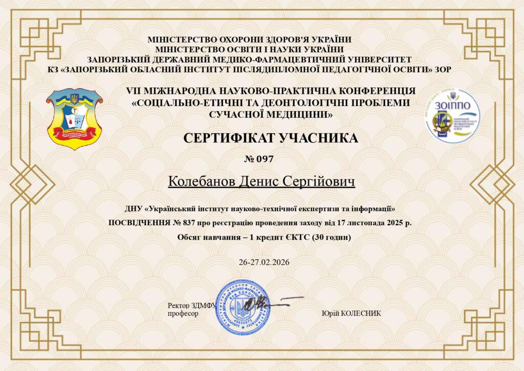 Доцент кафедри “Політологія та загальноправові дисципліни” Національного університету “Запорізька політехніка”, кандидат філософських наук, доцент РЄЗАНОВА Наталія та здобувач вищої освіти Національного університету “Запорізька політехніка” КОЛЕБАНОВ Денис прийняли участь у VІІ Міжнародній науково-практчиній конференції “Соціально-етичні та деонтологічні проблеми сучасної медицини”, яка була проведена 26-27 лютого 2026 року в м. Запоріжжя.