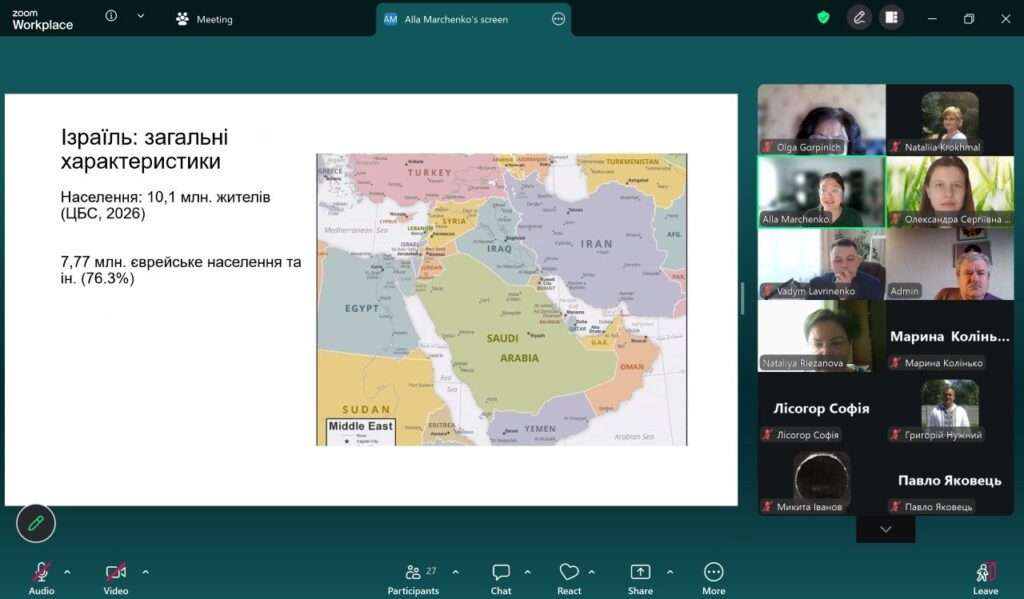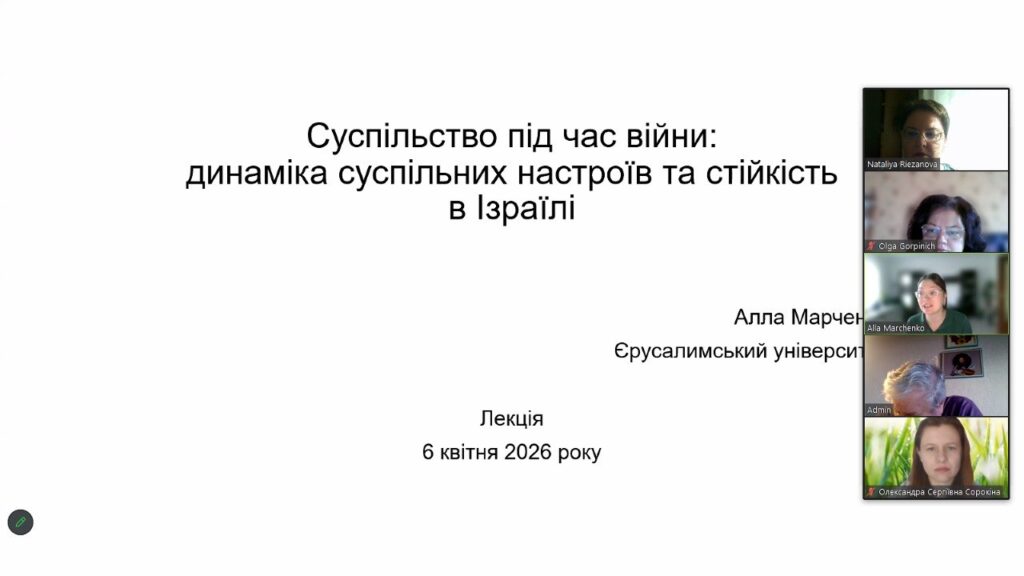 6 квітня 2026 року на запрошення кафедри філософії, соціології та політології Державного торговельно-економічного університету науково-педагогічні працівники кафедри “Політологія та загальноправові дисципліни” та здобувачі вищої освіти спеціальності 052 “Політологія” Національного університету “Запорізька політехніка” відвідали гостьову лекцію на тему: Суспільство під час війни: динаміка суспільних настроїв та стійкість в Ізраїлі, яку провела Алла МАРЧЕНКО, постдокторська дослідниця від фундації родини Кнапп в Міжнародному центрі вивчення антисемітизму імені Відала Сассуна (Єрусалимський університет), а також постдокторська дослідниця програми Скрипторіум, Національна бібліотека Ізраїлю.