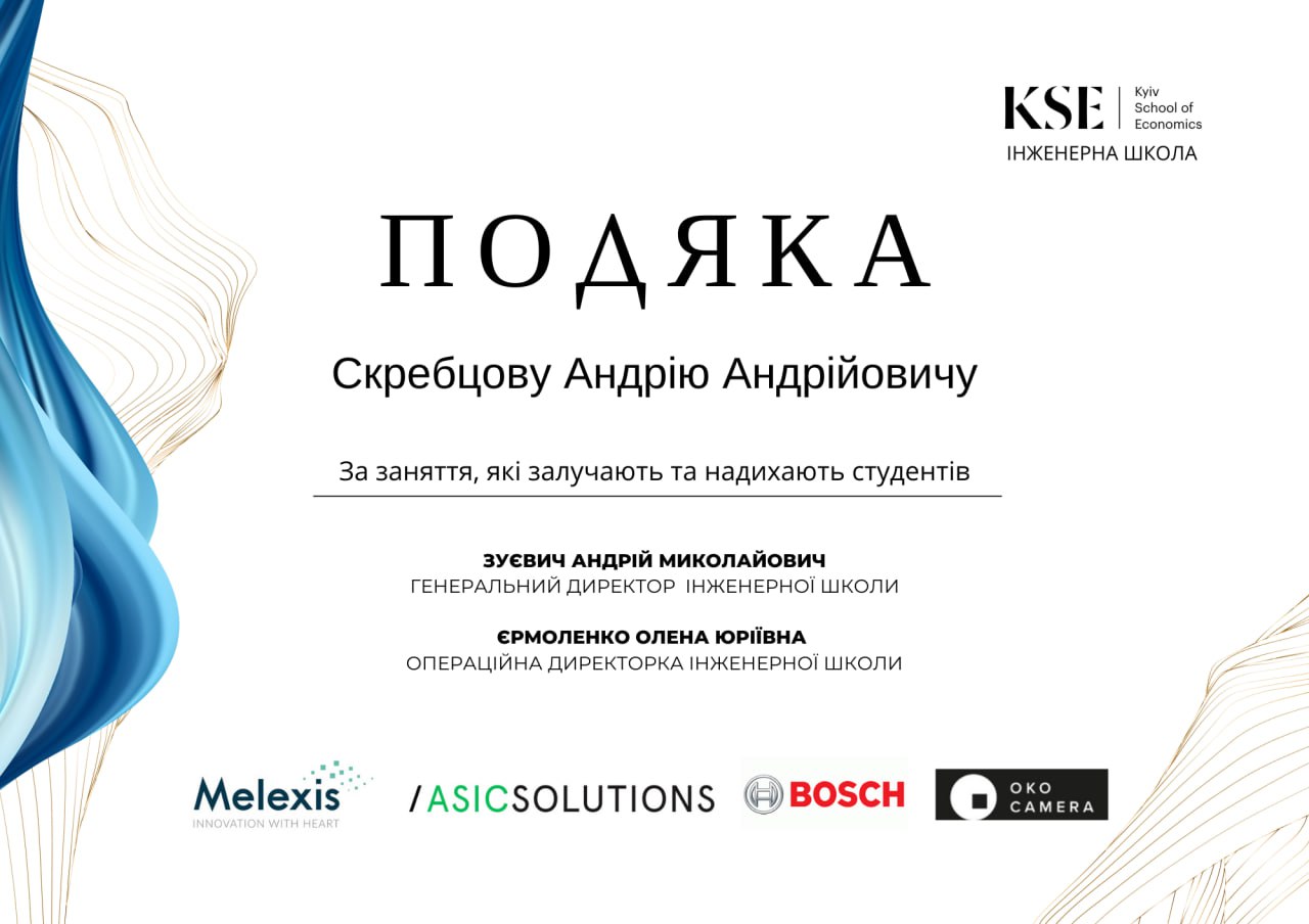 Доцент кафедри Андрій СКРЕБЦОВ 23 грудня 2024 р. отримав Подяку від Киїівської школи економіки (підрозділ Інженерна школа) “За заняття, які залучають та надихають студентів”. Кафедра бажає наступних звершень у викладацькій діяльності.