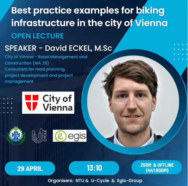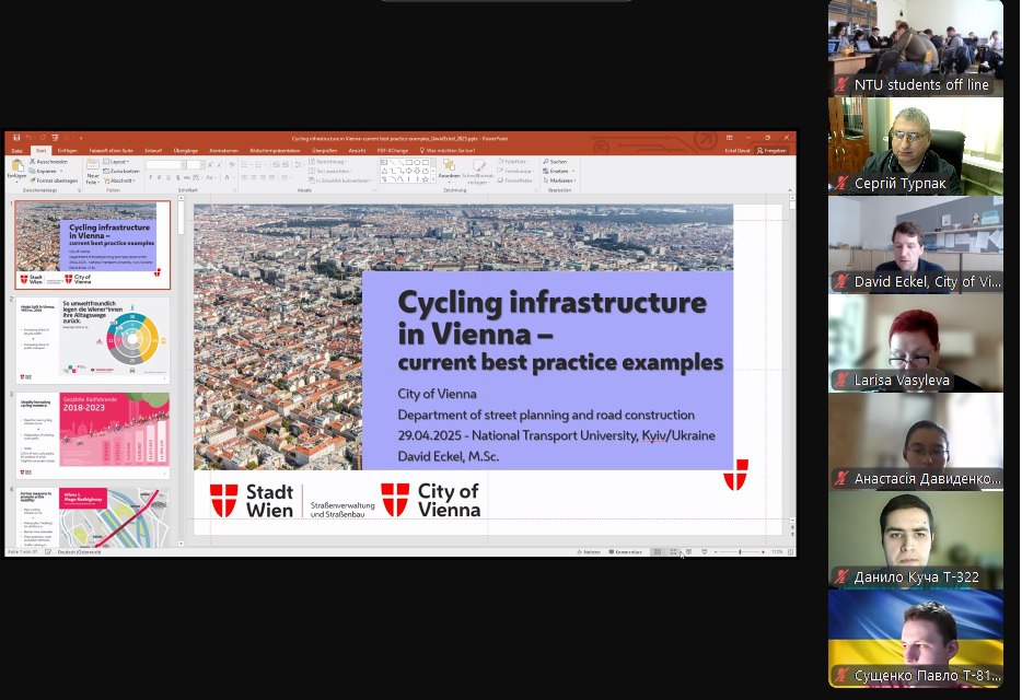 29 квітня відбулася відкрита лекція «Best practice examples for biking infrastructure in the city of Vienna / Приклади найкращих практик велосипедної інфраструктури у м. Відень». Лекція проходила в рамках реалізації першого в українській вищій освіті курсу «Планування та організація велосипедної мобільності» Національного транспортного університету.