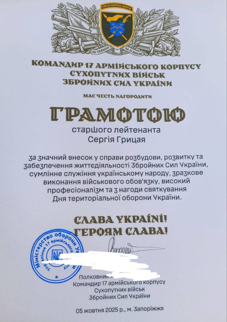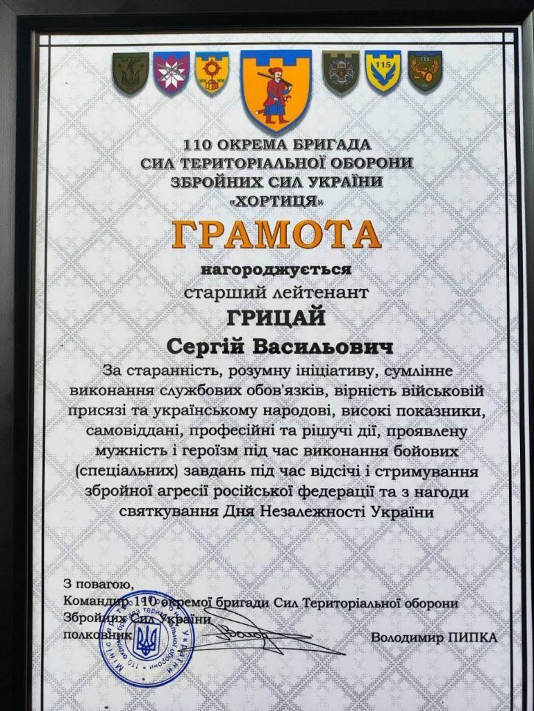 Старший викладач кафедри «Транспортні технології» ГРИЦАЙ Сергій Васильович продовжує службу в збройних силах України й приймає активну участь в захисті нашої країни від загарбників. Колектив кафедри «Транспортні технології» вітає Сергія Васильовича із черговою заслуженою нагородою, бажає міцного здоров’я й скорішого повернення до мирного життя.