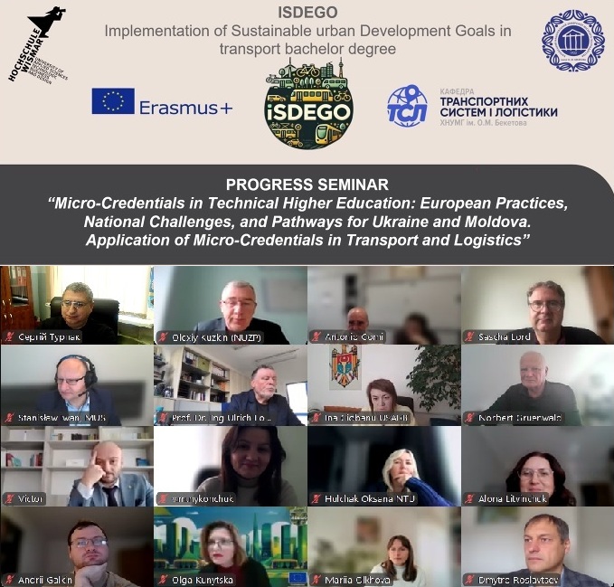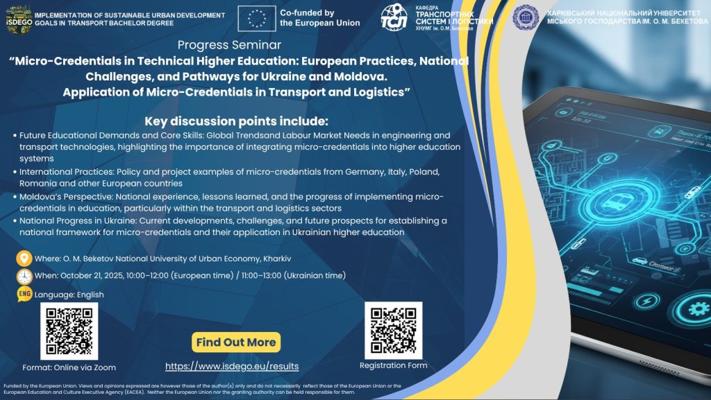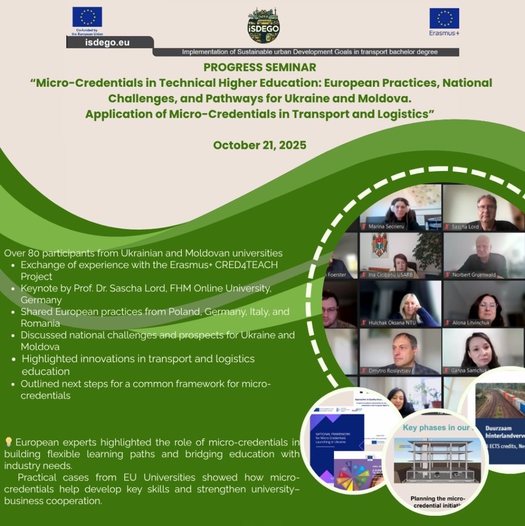 21 жовтня 2025 року міжнародний проект KA2 ISDEGO («Впровадження цілей сталого міського розвитку в галузі транспорту: бакалаврський ступінь») за програмою Erasmus+ проведе онлайн-семінар, на якому будуть представлені результати початкового дослідження мікро-кваліфікацій та представлений європейський та національний досвід у вищій освіті — з акцентом на транспорт і логістику в Україні та Молдові.
