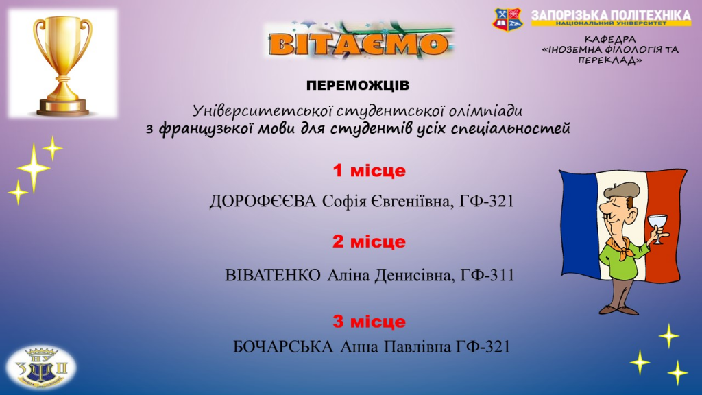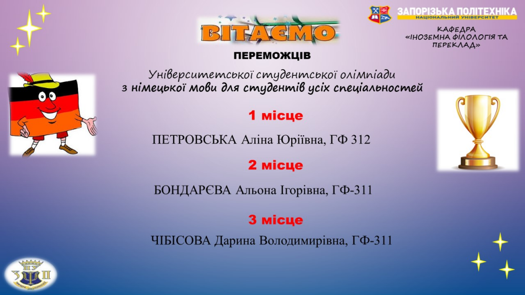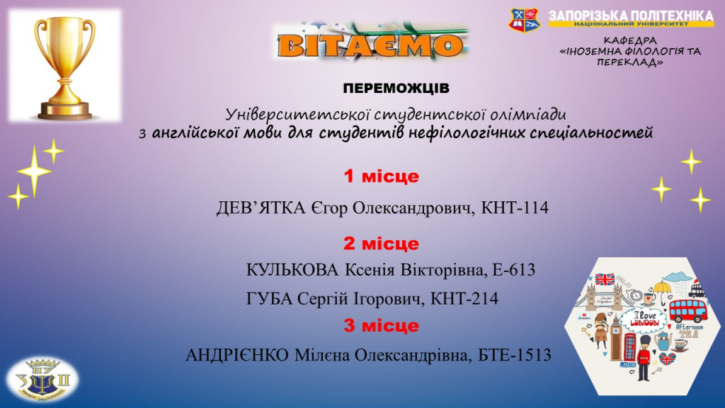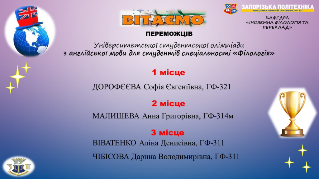 Кафедра “Іноземна філологія та переклад” активно заохочує студентів до участі в різноманітних олімпіадах та конкурсах, що є чудовою можливістю продемонструвати свої знання, навички та творчі здібності, а також отримати цінний досвід та визнання.