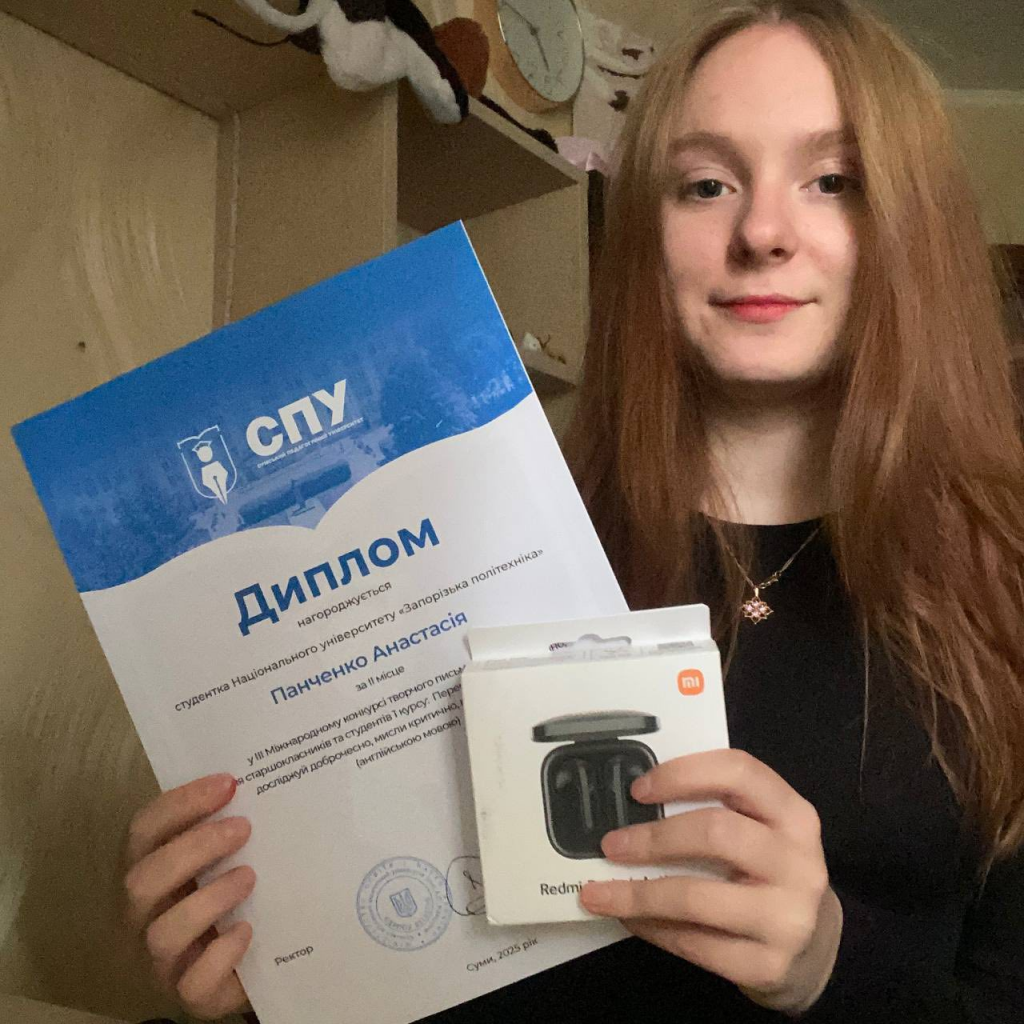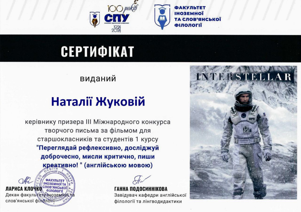 Навесні студенти НУ «Запорізька політехніка» взяли участь у III Міжнародному конкурсі творчого письма англійською мовою «Переглядай рефлексивно, досліджуй доброчесно, мисли критично, пиши креативно!» за художнім фільмом «Інтерстеллар». Конкурс відбувся за сприянням кафедри англійської філології та лінгводидактики Сумського державного педагогічного університету імені А.С. Макаренка.