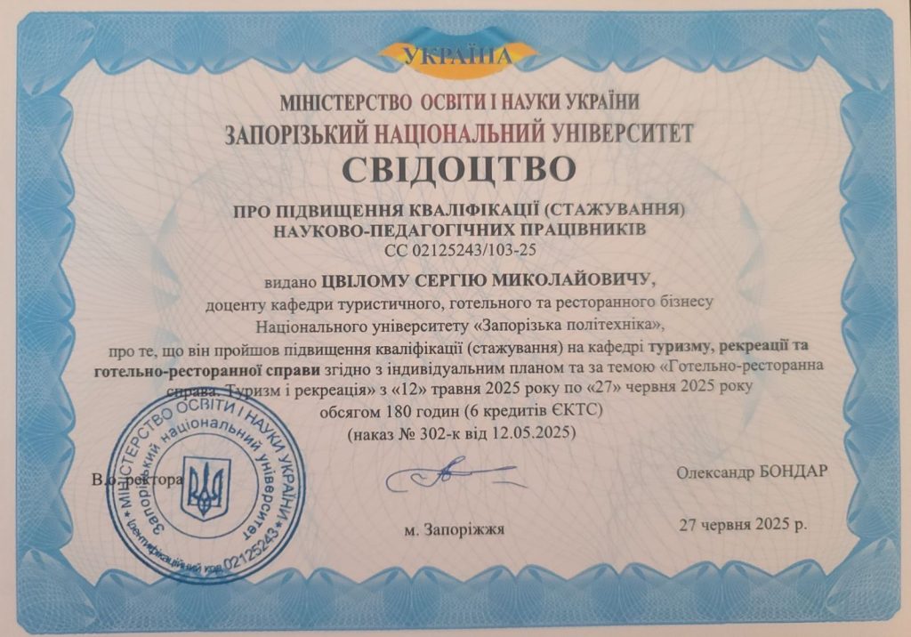 | Цвілий Сергій Миколайович | к.е.н., доц. | 2025 | ЗНУ, кафедра туризму, рекреації та готельно-ресторанної справи | 2030 |