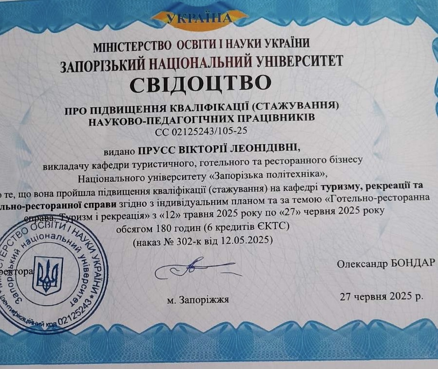 | Прусс Вікторія Леонідівна | ст. викл. | 2025 | ЗНУ, кафедра туризму, рекреації та готельно-ресторанної справи | 2030 |