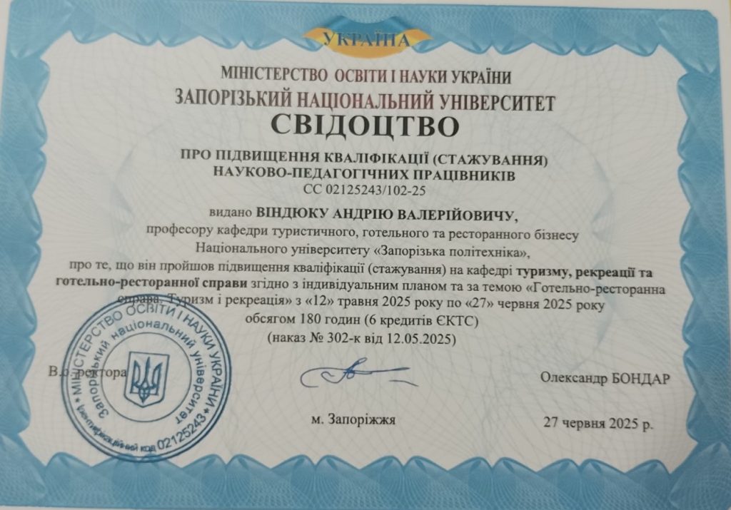 | Віндюк Андрій Валерійович | д.пед.н., проф | 2025 | ЗНУ, кафедра туризму, рекреації та готельно-ресторанної справи | 2030 |