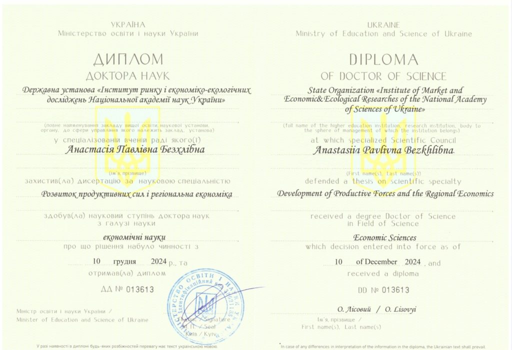| Безхлібна Анастасія Павлівна | д.е.н., доц. | 2023 2025 | Участь у VI міжнародному науковому конгресі «Суспільство середовищного інтелекту 2023» (6 кредитів ects) (ISC – SAI 2023: Індія – Португалія – Україна – Латвія – Румунія – Узбекистан) Захист докторської дисертації | 2030 |