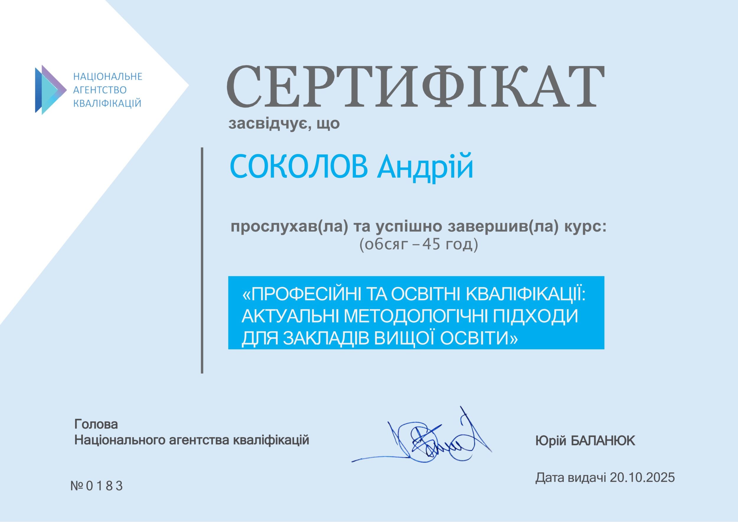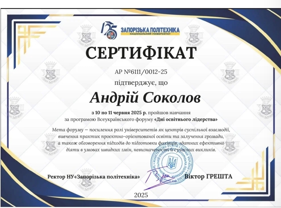 Сертифікат успішного завершення курсу «Професійні та освітні кваліфікації: актуальні метедологічні підходи для закладів вищої освіти» (2025 р.)