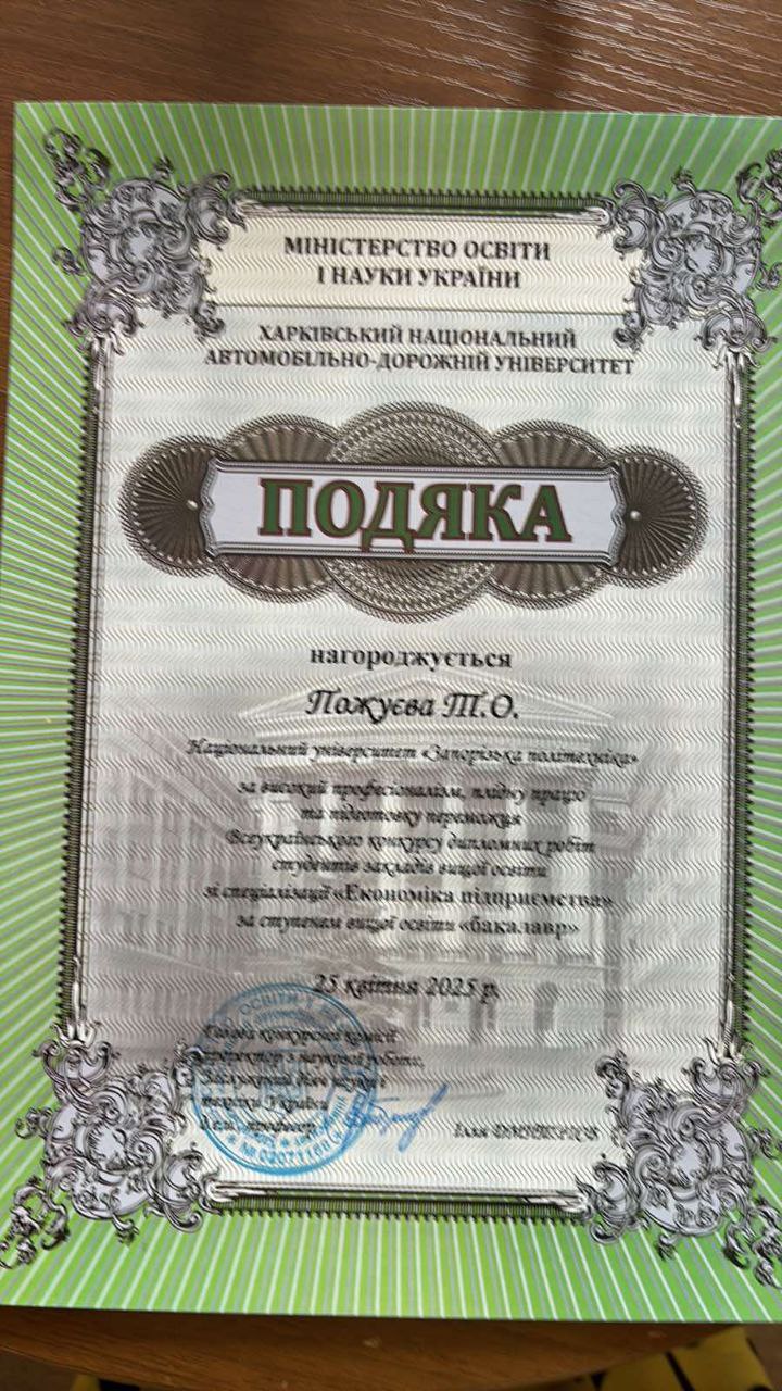 2 місце серед бакалаврів зі спеціалізації «Економіка підприємства» посів Євген Марущенко. Науковою керівницею була професорка Тетяна Пожуєва.