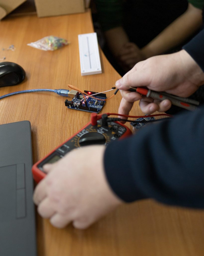 1. Основи фізики та електроніки: навчимося складати прості електричні схеми, ознайомимося з основними поняттями струму, напруги та навантаження. На цьому етапі ви зберете свій перший проект зі світлодіодами та кнопками.