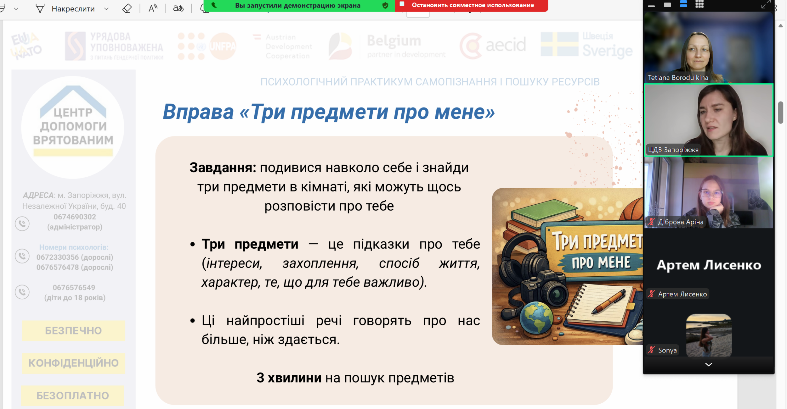 3 квітня успішно відбувся психологічний практикум самопізнання і пошуку ресурсів. Його провели Вікторія Вертеба, психологиня Центру, стейкхолдерка і випускниця кафедри психології НУ «Запорізька політехніка» і Тетяна Бородулькіна, психологиня Центру, доцентка кафедри психології НУ «Запорізька політехніка». Практикум був спрямований на розуміння підлітками і юнаками свого внутрішнього світу, зміцнення свого «Я», розширення погляду на себе та своє життя, що є важливою запорукою того, що молода людина зможе гідно подолати життєві труднощі й впоратися зі стресами сьогодення. На занятті було багато цікавих вправ: на знайомство і комунікацію, «Я у вигляді дерева: мої особливості та сильні сторони» (робота з метафоричними картками), на самозаспокоєння і відновлення «Мої ресурси самодопомоги».