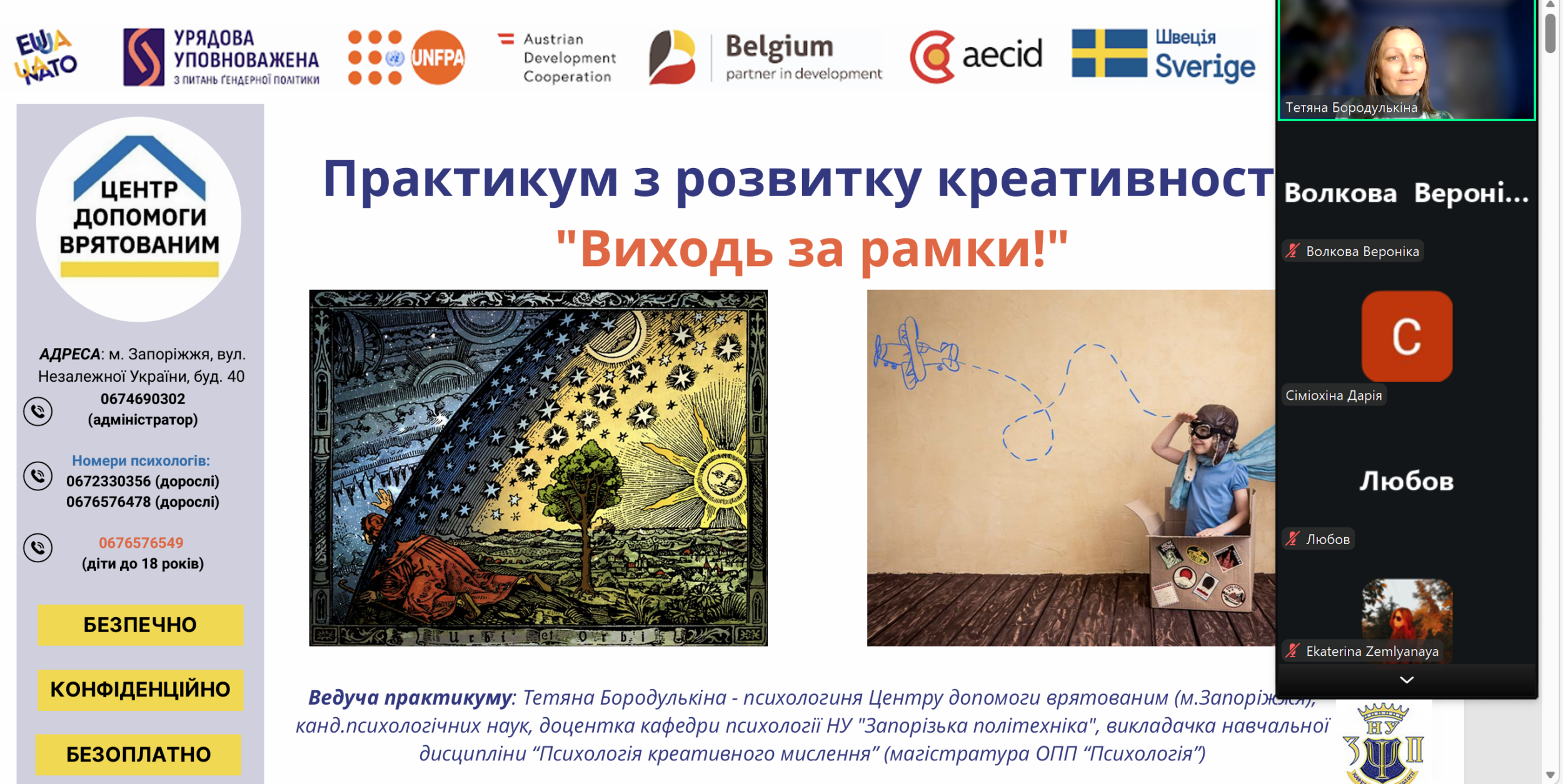 Партнерками кафедри — психологинями Центру — було проведено 2 онлайн-практикуми. Основними учасниками заходу стали вихованці Юнацького руху «Байда» (Космічний і Шевченківський осередки).