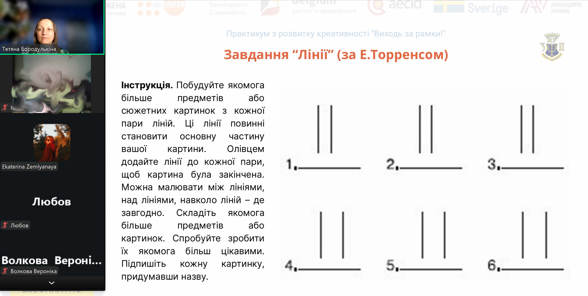 24 квітня Тетяна Бородулькіна провела практикум з розвитку креативності «Виходь за рамки!». Учасники проаналізували, що таке «креативність» і «творчість», якими якостями володіє «креативна людина», потренували креативне мислення, виконали вправи на розвиток креативності.