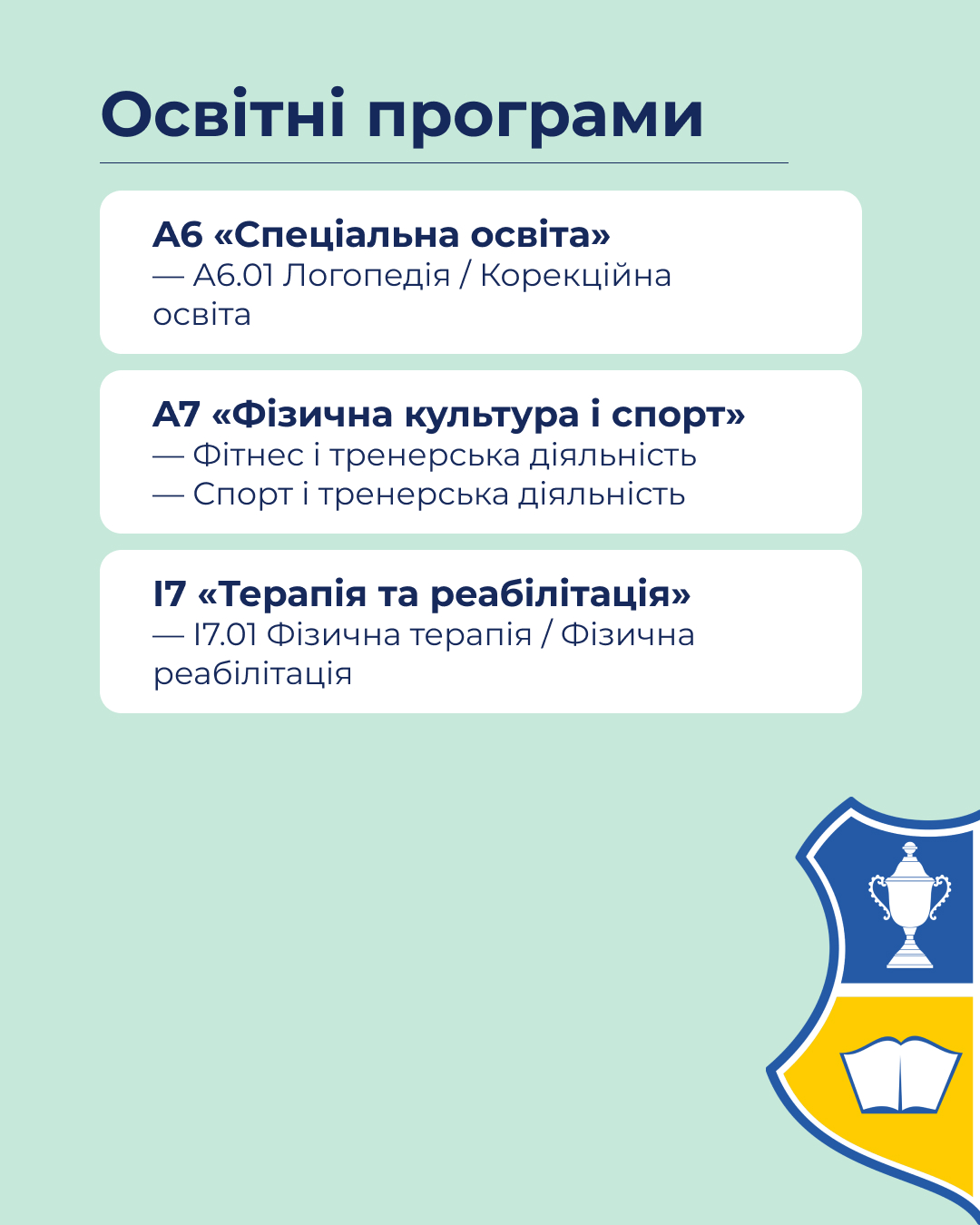 Дивись освітні програми, які допомагають виховувати чемпіонів. Обирай професію, яка відповідає поклику. Знайомся з партнерами, які стануть надійною підтримкою.
