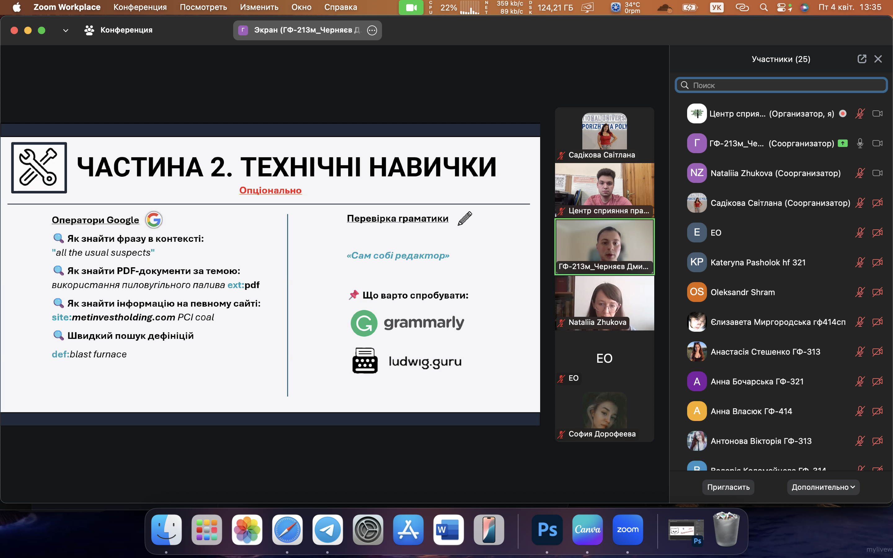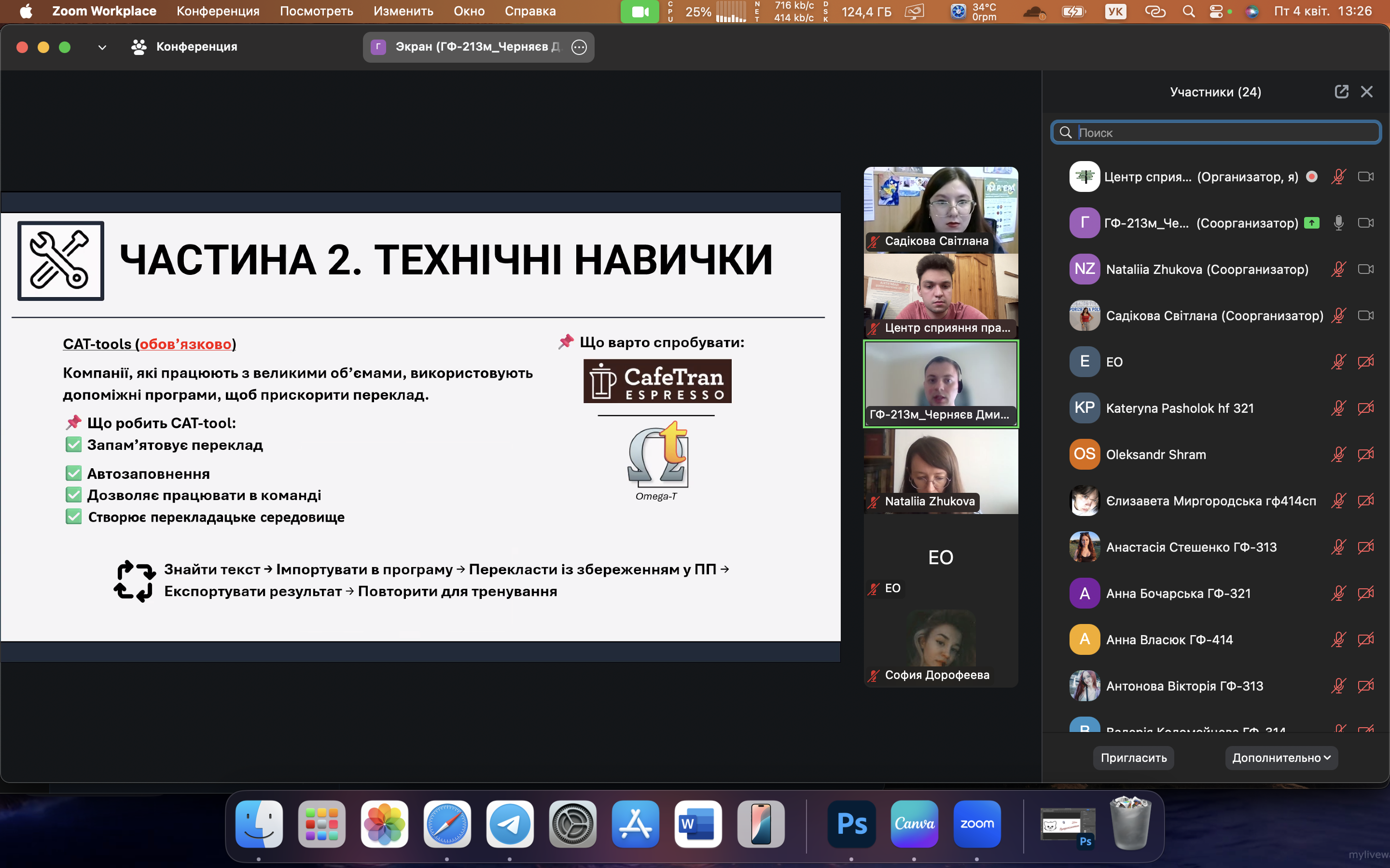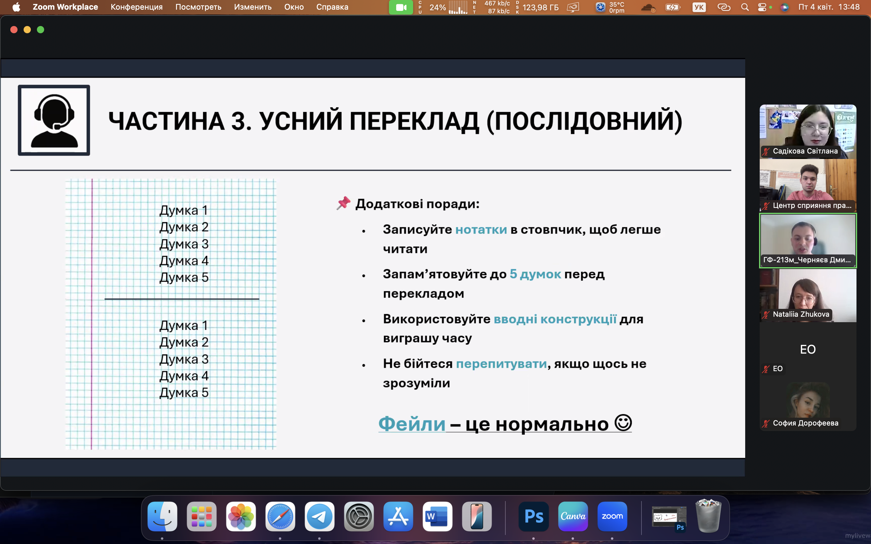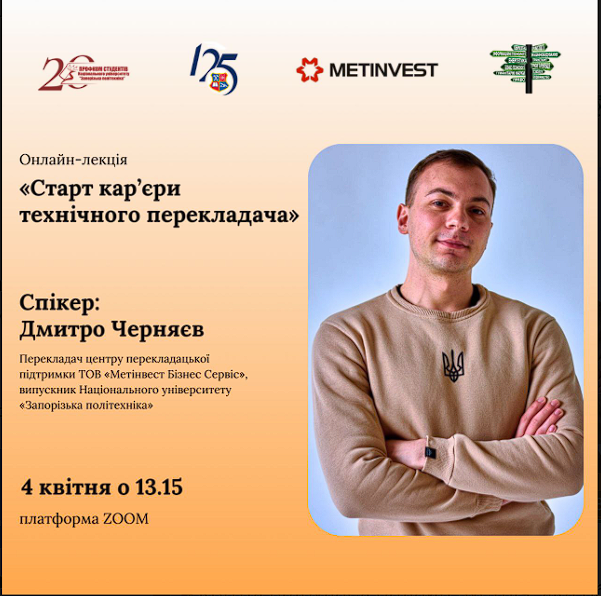 4 квітня відбулася онлайн-зустріч, яка об’єднала студентів, випускників та викладачів Запорізької політехніки, зацікавлених у розвитку кар’єри в сфері технічного перекладу. Спікером заходу виступив Дмитро Черняєв — перекладач центру перекладацької підтримки ТОВ «Метінвест Бізнес Сервіс», випускник НУ «Запорізька політехніка». Під час зустрічі Дмитро поділився практичними порадами щодо побудови кар’єри у сфері технічного перекладу. Особливу увагу він приділив значенню як письмового, так і усного перекладу в роботі технічного фахівця, наголосивши на важливості володіння обома напрямами для професійного зростання. Зустріч пройшла в інтерактивному форматі, з активною участю слухачів, які ставили запитання та ділилися своїми думками. Було обговорено багато практичних аспектів роботи перекладача, а також значення міждисциплінарної підготовки у сучасному ринку праці.