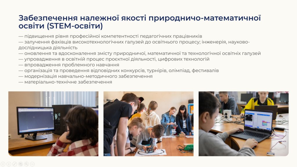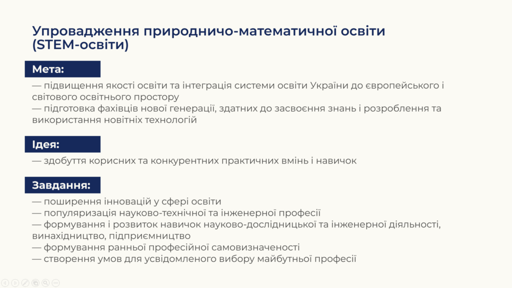 Концепція розвитку природничо-математичної освіти спрямована на модернізацію STEM-освіти, широкомасштабне її впровадження на всіх складниках та рівнях освіти. Основна ідея STEM-освіти — здобувати не теоретичну освіту, відірвану від реального світу, а корисні та конкурентні практичні вміння та навички.