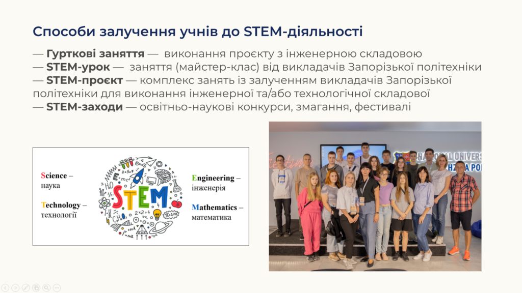 STEM-освіта = розвиток навичок науково-дослідної та інженерної діяльності + винахідництво + підприємництво + рання профорієнтація + формування сталого інтересу до інженерних професій