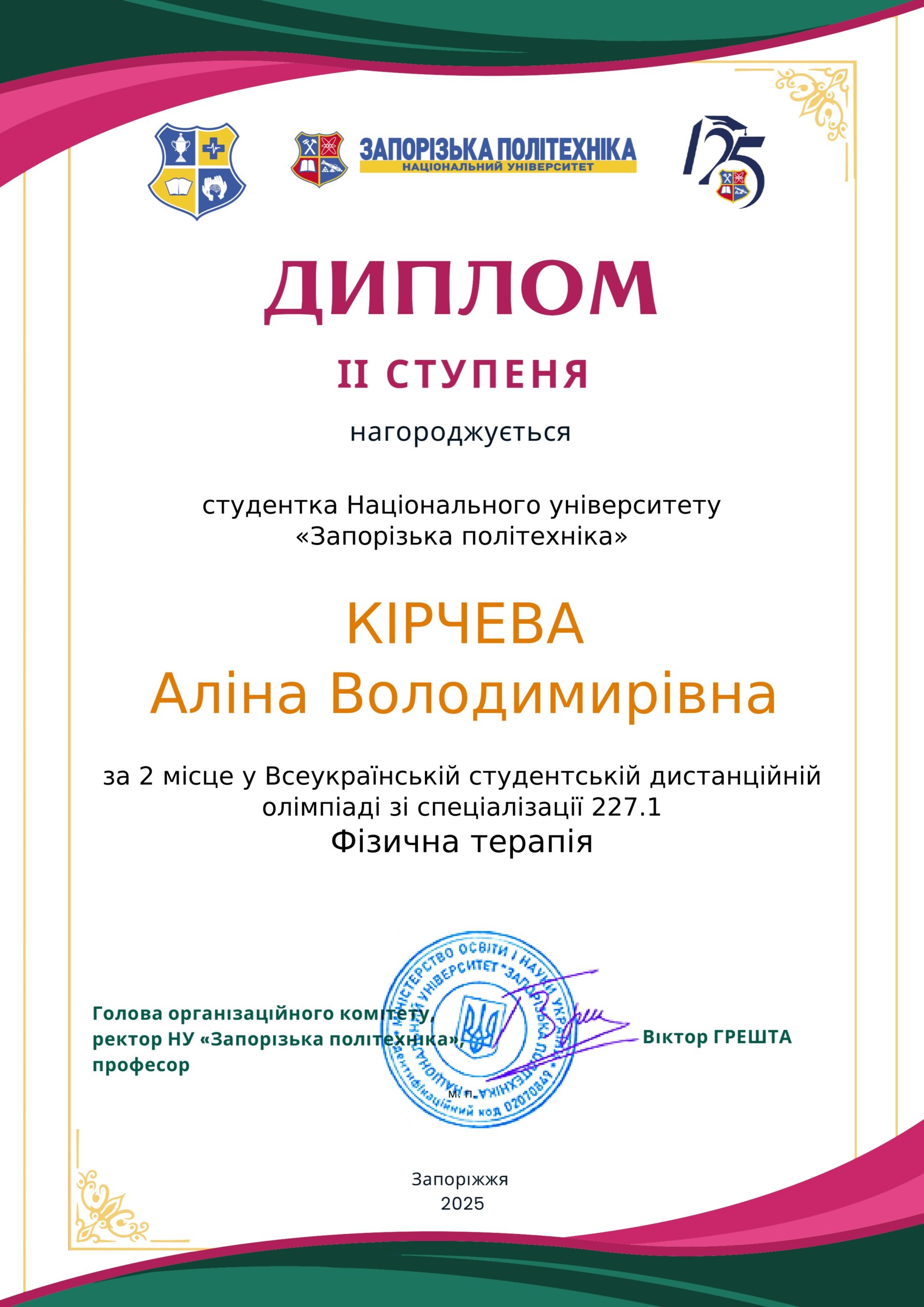 НУ «Запорізька політехніка» цьогоріч ініціювала I Всеукраїнську студентську дистанційну олімпіаду зі спеціалізації «Фізична терапія». Захід відбувався на базі кафедри фізичної терапії та ерготерапії і був присвячений 125–річчю Запорізької політехніки.