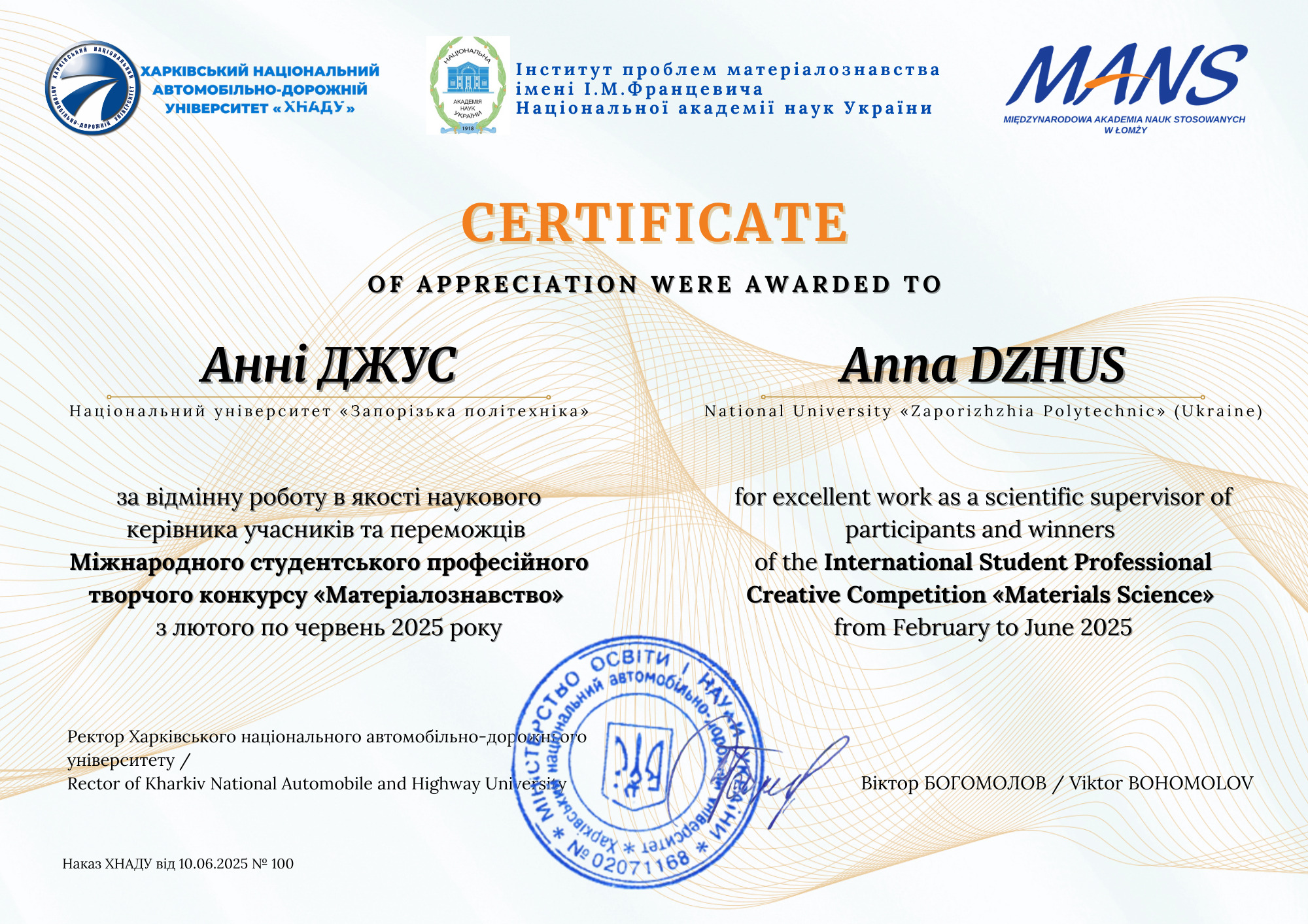 Завершився Міжнародний студентський професійний творчий конкурс «Матеріалознавство», який проходив на базі Харківського національного автомобільно-дорожнього університету. Конкурс реалізовано під патронатом Інституту проблем матеріалознавства імені І. М. Францевича Національної академії наук України, спільно з Міжнародною академією прикладних наук в Ломжі.