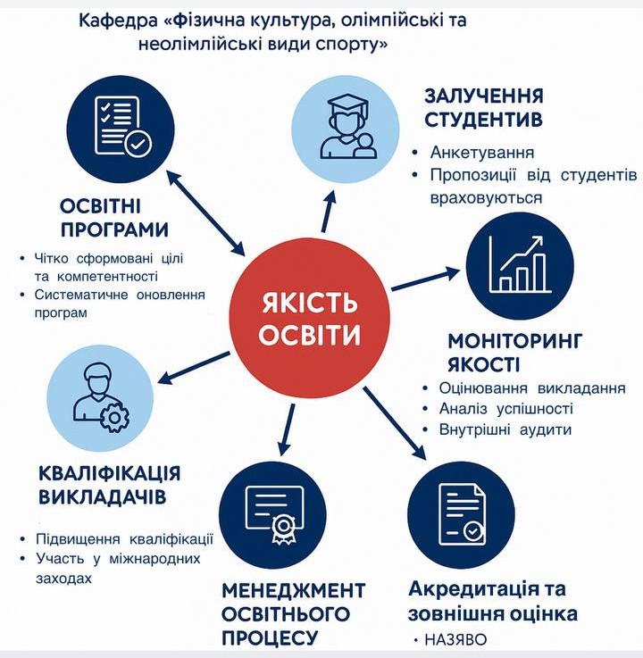 Забезпечення якості освіти — один із головних пріоритетів кафедри «Фізична культура, олімпійські та неолімпійські види спорту». Для цього впроваджено ефективну систему моніторингу, яка охоплює всі категорії учасників освітнього процесу.