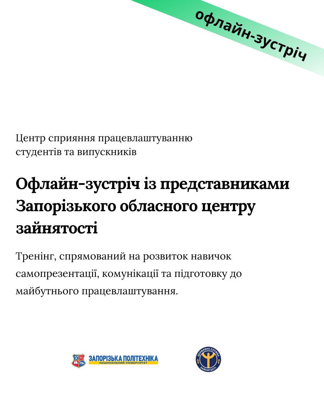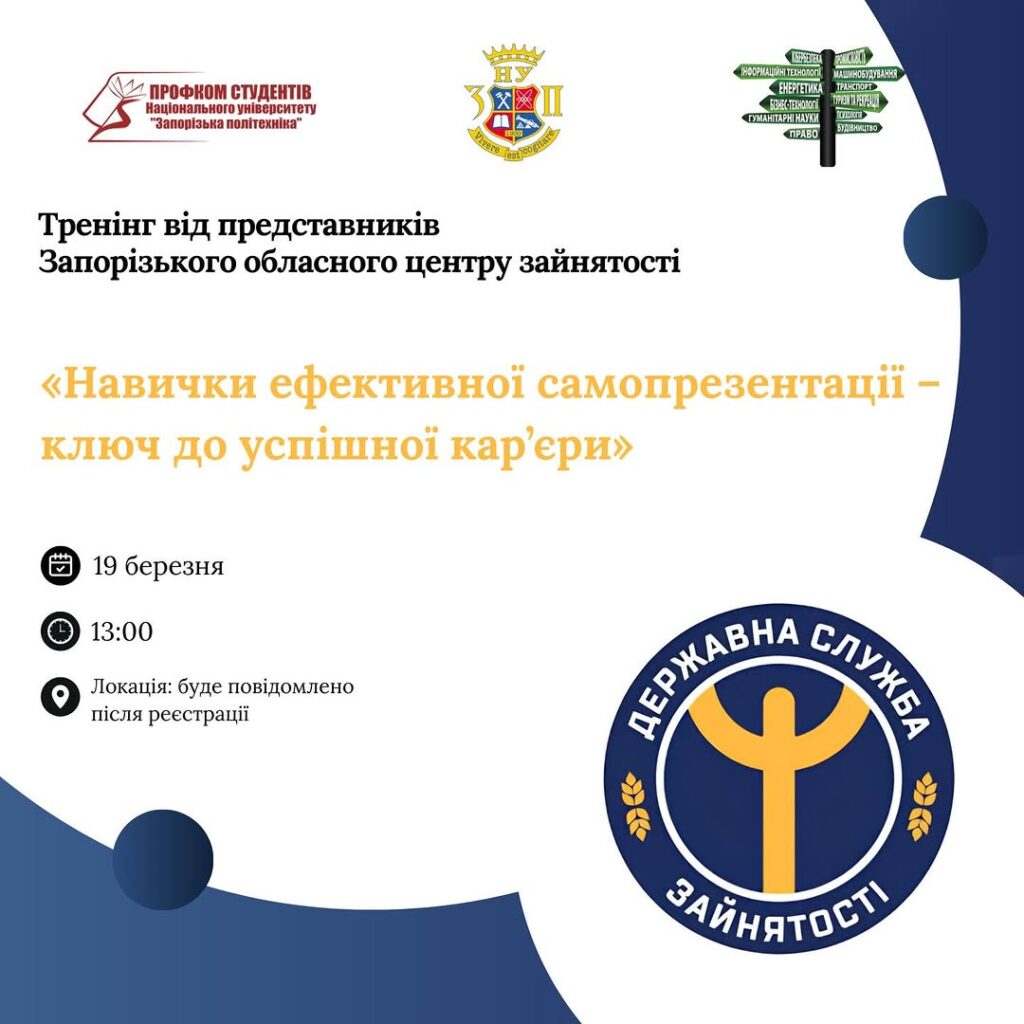 💼 Запорізький обласний центр зайнятості запрошує студентів Запорізької політехніки та фахових коледжів на тренінг «Навички ефективної самопрезентації – ключ до успішної кар’єри»