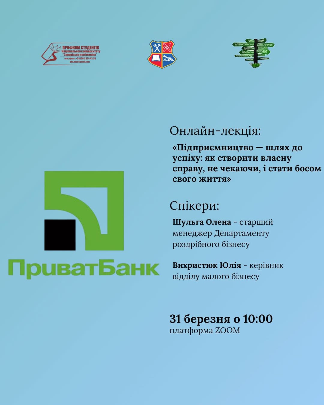 🏪 31 березня студенти та викладачі Національного університету «Запорізька політехніка» долучилися до онлайн-зустрічі з представниками АТ КБ «ПриватБанк» на тему «Підприємництво — шлях до успіху: як створити власну справу, не чекаючи, і стати босом свого життя».