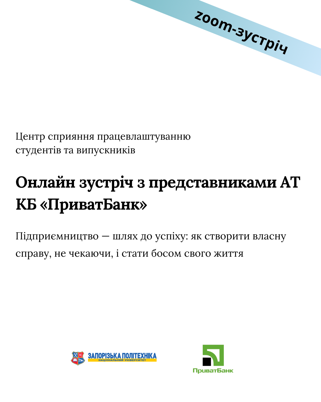 🚀 АТ КБ «ПриватБанк» запрошує студентів Запорізької політехніки та фахових коледжів на онлайн-зустріч «Підприємництво — шлях до успіху: як створити власну справу, не чекаючи, і стати босом свого життя»